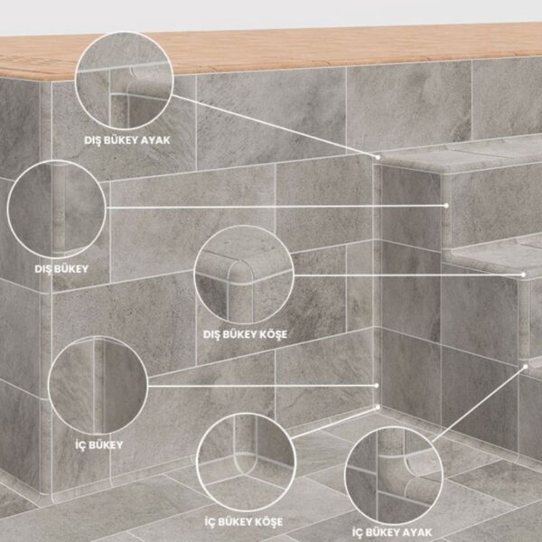Tüm dışbükey köşe parçaları, yüksek dayanıklılığa sahip %100 porselenden üretilmiştir. Uzun ömürlü kullanım ve yüksek performans sunar. -